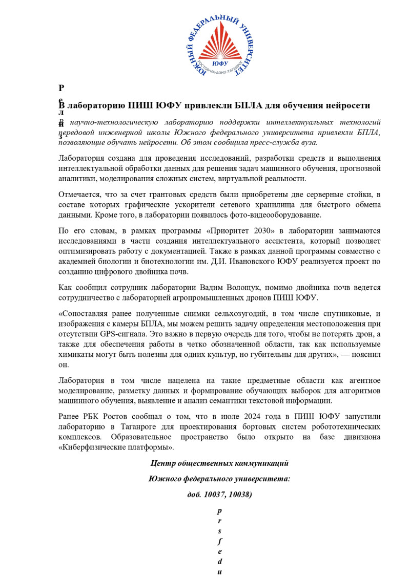 Ранее РБК Ростов сообщал о том, что в июле 2024 года в ПИШ ЮФУ запустили лабораторию в Таганроге для проектирования бортовых систем робототехнических комплексов. Образовательное пространство было открыто на базе дивизиона «Киберфизические платформы».